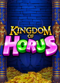 Kingdom of Horus brings a lively cartoon touch to its ancient Egyptian online slots theme. The 5x3 grid sits inside a grand temple, framed by tall pillars covered in mosaics of Horus and detailed hieroglyphs. Gold coins spill across the floor, catching the glow of deep blue and gold tones that dominate the scene.